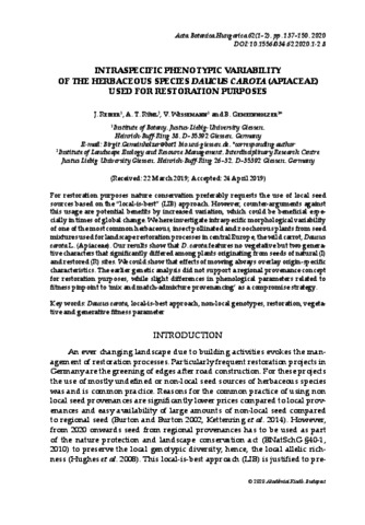 Reiker, J. and Rühl, A. T. and Wissemann, V. and Gemeinhülzer, B. (2020) Intraspecific phenotypic variability of the herbaceous species Daucus carota (Apiaceae) used for restoration purposes. ACTA BOTANICA HUNGARICA, 62 (1-2). pp. 137-150. ISSN 0236-6495