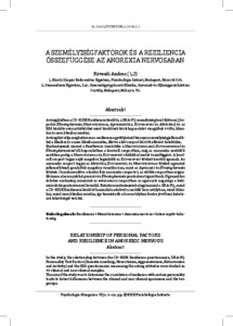 A vizsgálatban a CD-RISK Reziliencia kérdőív, a ZKA-PQ személyiségteszt faktorai (Impulzív Élménykeresés, Neuroticizmus, Agresszivitás, Extraverzió és Aktivitás) és az EDI kérdőív evési attitűdöket mérő kérdőívek közti kapcsolatot vizsgáltuk 44 fős, klinikai és nem klinikai mintán. A vizsgálat célja meghatározni a reziliencia együttjárását bizonyos személyiségjellemzőkkel a klinikai és a nem klinikai mintán, illetve a két csoport közötti eltérést detektálni. Eredményeink szerint a Reziliencia összértéke a Neuroticizmussal, Extraverzióval és Élménykereséssel áll kapcsolatban a kontroll csoportban, míg az anorexiás serdülők esetében pedig a Neuroticizmus és Extraverzió skálákkal mutat összefüggést. A kontroll csoport tagjai saját magukra leginkább az Extraverzió tételeit érezték igaznak. Az anorexiás csoport tagjai az Aktivitás, Extraverzió, és Neuroticizmus tételeit egyaránt jellemzőbbnek gondolták magukra vonatkozóan, mint az Agresszió és Élménykeresés tételeit. Összehasonlítva a kontroll és anorexiás csoportot, az utóbbi csoportban szignifikánsan alacsonyabb Agresszió és Élménykeresés pontszámot igazoltunk. Ugyanakkor érdekes eredmény, miszerint az evészavaros csoportban az agresszió nagysága a bulimiás skála pontszámával korrelál. Kutatási eredményeink alapján mind a ZKA-PQ, mind a CD-RISK Reziliencia kérdőív használata adekvát a serdülő korosztályban, mind klinikai, mind nem klinikai mintán, így bemérésük a korosztályban fontos jövőbeni kutatások lehetőségét veti fel.