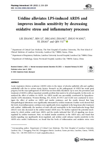 Zhang, Lei and Li, Bin and Zhang, Degang and Wang, Zhuo and Zhao, Ye and Yu, Qin (2022) Uridine alleviates LPS-induced ARDS and improves insulin sensitivity by decreasing oxidative stress and inflammatory processes. Physiology International, 109 (2). pp. 215-229. ISSN 2498-602X