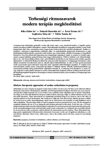 Riba, Ádám and Németh, Barnabás and Árvai, Ferenc and Lupkovics, Géza and Tahin, Tamás (2021) Terhességi ritmuszavarok modern terápiás megközelítései = Modern therapeutic approaches of cardiac arrhythmias in pregnancy. ORVOSI HETILAP, 162 (41). pp. 1643-1651. ISSN 0030-6002