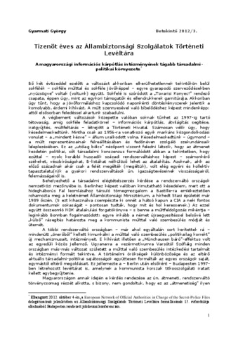 Gyarmati, György (2012) Tizenöt éves az Állambiztonsági Szolgálatok Történeti Levéltára : A magyarországi információs kárpótlás intézményének tágabb társadalmi-politikai környezete. BETEKINTŐ, 6 (3). ISSN 1788-7569