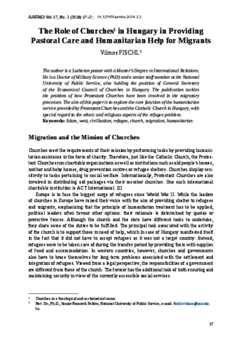 Fischl, Vilmos (2018) The Role of Churches in Hungary in Providing Pastoral Care and Humanitarian Help for Migrants. ACADEMIC AND APPLIED RESEARCH IN MILITARY AND PUBLIC MANAGEMENT SCIENCE, 17 (2). pp. 17-28. ISSN 2498-5392