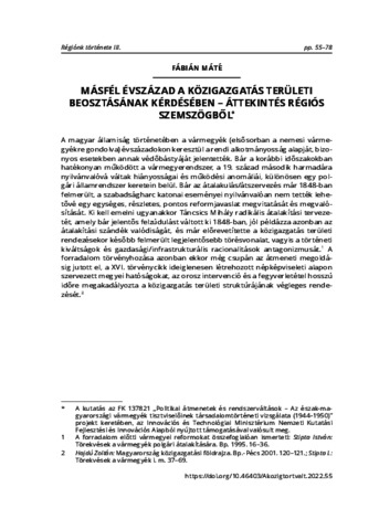 Fábián, Máté (2022) Másfél évszázad a közigazgatás területi beosztásának kérdésében : Áttekintés régiós szemszögből. In: A közigazgatás történeti változásai Észak(kelet)- Magyarországon a modern korban. Régiónk története (3). Eszterházy Károly Katolikus Egyetem Líceum Kiadó, Eger, pp. 55-78. ISBN 978-963-496-237-3