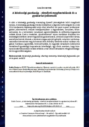 Kalóz, Eszter (2015) A közösségi gazdaság: elméleti megfontolások és a gyakorlat jellemzői. INFORMÁCIÓS TÁRSADALOM: TÁRSADALOMTUDOMÁNYI FOLYÓIRAT, 15 (1). pp. 44-67. ISSN 1587-8694
