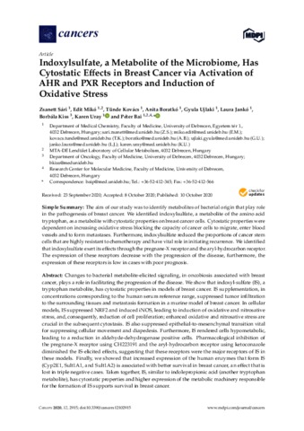 Sári, Zsanett Mercédesz and Mikó, Edit and Kovács, Tünde and Boratkó, Anita and Ujlaki, Gyula and Jankó, Laura and Kiss, Borbála Katalin and Uray (Davis), Karen L. and Bay, Péter (2020) Indoxylsulfate, a metabolite of the microbiome, has cytostatic effects in breast cancer via activation of AHR and PXR receptors and induction of oxidative stress. CANCERS, 12 (10). ISSN 2072-6694