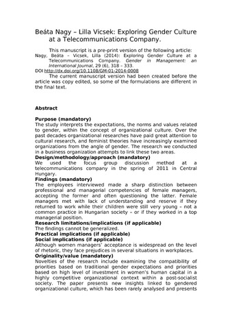 Abstract Purpose (mandatory) The study interprets the expectations, the norms and values related to gender, within the concept of organizational culture. Over the past decades organizational researches have paid great attention to cultural research, and feminist theories have increasingly examined organizations from the angle of gender. The research we conducted in a business organization attempts to link these two areas. Design/methodology/approach (mandatory) We used the focus group discussion method at a telecommunications company in the spring of 2011 in Central Hungary. Findings (mandatory) The employees interviewed made a sharp distinction between professional and managerial competencies of female managers, accepting the former and often questioning the latter. Female managers met with lack of understanding and reserve if they returned to work while their children were still very young – not a common practice in Hungarian society – or if they worked in a top managerial position. Research limitations/implications (if applicable) The findings cannot be generalized. Practical implications (if applicable) Social implications (if applicable) Although women managers’ acceptance is widespread on the level of rhetoric, they face prejudices in several situations in workplaces. Originality/value (mandatory) Novelties of the research include examining the compatibility of priorities based on traditional gender expectations and priorities based on high level of investment in women’s human capital in a highly competitive organizational context within a post-socialist society. The paper presents new insights linked to gendered organizational culture, which has been rarely analysed and presents data from a Central Eastern European society which differs in many respects from previously investigated countries. Keywords: gender culture, management, competencies, work-life balance