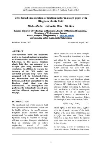 Minkó, Martin and Csizmadia, Péter and Till, Sára (2021) CFD based investigation of friction factor in rough pipes with Bingham plastic fluid. KÖRFORGÁSOS GAZDASÁG ÉS KÖRNYEZETVÉDELEM/CIRCULAR ECONOMY AND ENVIRONMENTAL PROTECTION, 5 (2). pp. 5-15. ISSN 2560-1024