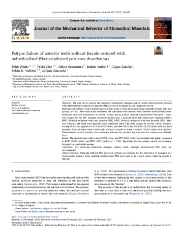 Fráter, Márk and Sáry, Tekla and Braunitzer, Gábor and Szabó P., Balázs and Lassila, Lippo (2021) Fatigue failure of anterior teeth without ferrule restored with individualized fiber-reinforced post-core foundations. JOURNAL OF THE MECHANICAL BEHAVIOR OF BIOMEDICAL MATERIALS, 118. pp. 1-7. ISSN 1751-6161