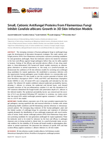 Holzknecht, Jeanett and Dubrac, Sandrine and Hedtrich, Sarah and Galgóczi, László Norbert and Marx, Florentine (2022) Small, Cationic Antifungal Proteins from Filamentous Fungi Inhibit Candida albicans Growth in 3D Skin Infection Models. MICROBIOLOGY SPECTRUM, 10 (3). ISSN 2165-0497