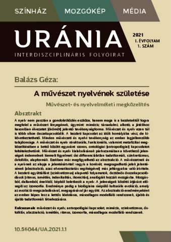 Balázs, Géza (2021) A művészet nyelvének születése : Művészet- és nyelvelméleti megközelítés. URÁNIA: INTERDISZCIPLINÁRIS FOLYÓIRAT : SZÍNHÁZ, MOZGÓKÉP, MÉDIA, 1 (1). pp. 6-23. ISSN 2786-3255 (Nyomtatott), 2939-5291 (Online)
