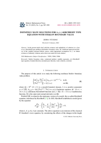Yücedag, Zehra (2022) Infinitely many solutions for a p(x)-Kirchhoff type equation with Steklov boundary value. Miskolc Mathematical Notes, 23 (2). pp. 987-999. ISSN 1787-2413