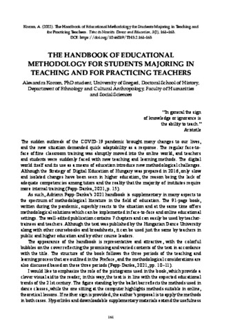 Korom, Alexandra (2022) The Handbook of Educational Methodology for Students Majoring in Teaching and for Practicing Teachers. TÁNC ÉS NEVELÉS / DANCE AND EDUCATION, 3 (2). pp. 161-163. ISSN 2732-1002