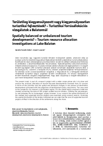Horváth, Zoltán and Alpek, Balázs Levente (2020) Területileg kiegyensúlyozott vagy kiegyensúlyozatlan turisztikai fejlesztések? – Turisztikai forrásallokációs vizsgálatok a Balatonnál = Spatially balanced or unbalanced tourism developments? – Tourism resource allocation investigations at Lake Balaton. TURIZMUS BULLETIN, 20 (2). pp. 33-41. ISSN 1416-9967