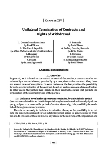 Veress, Emőd and Hulmák, Milan and Zimnioková, Markéta and Stępkowski, Łukasz and Dudás, Attila and Hlušák, Milan (2022) Unilateral Termination of Contracts and Rights of Withdrawal. In: Contract Law in East Central Europe. Central European Academic Publishing, Miskolc; Budapest, pp. 461-503.