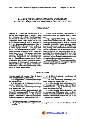 Vörös, István (2015) A Maros-torkolattal szembeni mikrorégió10. századi sírjainak archaeozoológiai vizsgálata. In: Régészeti és természettudományi adatok a Maros-torkolat nyugati oldalának 10. századi történetéhez. Bölcsészettudományi Kutatóközpont Magyar Őstörténeti Témacsoport Kiadványok; Studia ad Archaeologiam Pazmaniensia (4). Pázmány Péter Katolikus Egyetem BTK, Budapest, pp. 465-486. ISBN 9789639911802