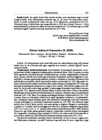 Fábián, Zsuzsanna (2021) Rivista Italiana di Onomastica 26. (2020). Főszerkesztő: Enzo Caffarelli. Società Editrice Romana – ItaliAteneo, Róma. 1110 lap (1. 562 lap, 2. 548 lap). NÉVTANI ÉRTESÍTŐ, 43. pp. 253-255. ISSN 0139-2190