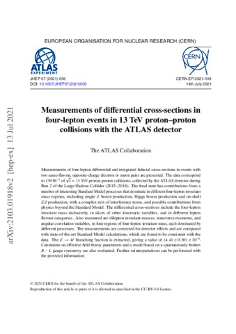 Aad, G. and Abbott, B. and Abbott, D. C. and Abud, A. A. and Abeling, K. and Tóth, József (2021) Measurements of differential cross-sections in four-lepton events in 13 TeV proton-proton collisions with the ATLAS detector. JOURNAL OF HIGH ENERGY PHYSICS (7). ISSN 1126-6708