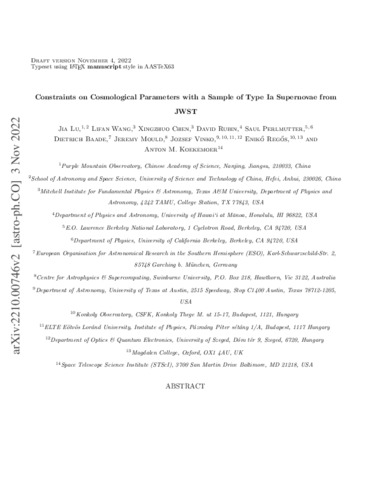 Lu, Jia and Wang, Lifan and Chen, Xingzhuo and Rubin, David and Perlmutter, Saul and Vinkó, József and Regős, Enikő (2022) Constraints on Cosmological Parameters with a Sample of Type Ia Supernovae from JWST. ASTROPHYSICAL JOURNAL, 941 (1). ISSN 1538-4357