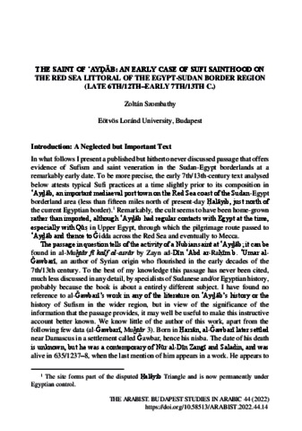 Szombathy, Zoltán (2022) The Saint of ʿAyḏāb: An Early Case of Sufi Sainthood on the Red Sea Littoral of the Egypt-Sudan Border Region (late 6th/12th–early 7th/13th c.). THE ARABIST : BUDAPEST STUDIES IN ARABIC, 44. pp. 229-240. ISSN 0239-1619