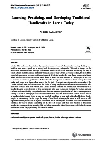 Karlsone, Anete (2021) Learning, Practicing and Developing Traditional Handicrafts in Latvia Today. ACTA ETHNOGRAPHICA HUNGARICA : AN INTERNATIONAL JOURNAL OF SOCIOCULTURAL ANTHROPOLOGY. A PERIODICAL OF THE HUNGARIAN ACADEMY OF SCIENCES, 66 (2). pp. 305-323. ISSN 1216-9803 (print); 1588-2586 (online)