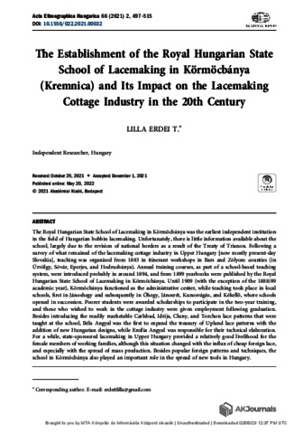 Erdei T., Lilla (2021) The Establishment of the Royal Hungarian State School of Lacemaking in Körmöcbánya (Kremnica) and Its Impact on the Lacemaking Cottage Industry in the 20th Century. ACTA ETHNOGRAPHICA HUNGARICA : AN INTERNATIONAL JOURNAL OF SOCIOCULTURAL ANTHROPOLOGY. A PERIODICAL OF THE HUNGARIAN ACADEMY OF SCIENCES, 66 (2). pp. 497-515. ISSN 1216-9803 (print); 1588-2586 (online)