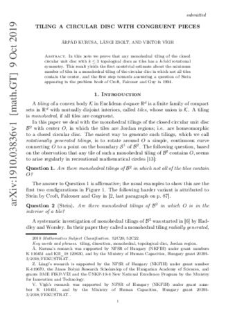 Kurusa, Árpád and Lángi, Zsolt and Vígh, Viktor (2020) Tiling a circular disc with congruent pieces. MEDITERRANEAN JOURNAL OF MATHEMATICS, 17 (5). ISSN 1660-5446