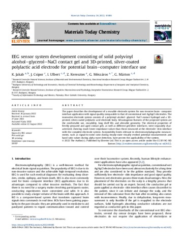Jakab, K. and Csipor, J. and Ulbert, I. and Keresztes, Zs. and Mészáros, G. and Márton, G. (2022) EEG Sensor System Development Consisting of Solid Polyvinyl Alcohol–Glycerol–NaCl Contact Gel and 3D-Printed, Silver-Coated Polylactic Acid Electrode for Potential Brain-Computer Interface Use. MATERIALS TODAY CHEMISTRY, 26. pp. 1-13. ISSN 2468-5194