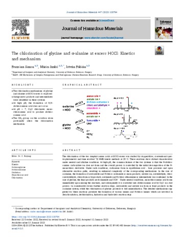 Simon, Fruzsina and Szabó, Mária and Fábián, István (2023) The chlorination of glycine and α-alanine at excess HOCl: kinetics and mechanism. JOURNAL OF HAZARDOUS MATERIALS, 447. ISSN 0304-3894