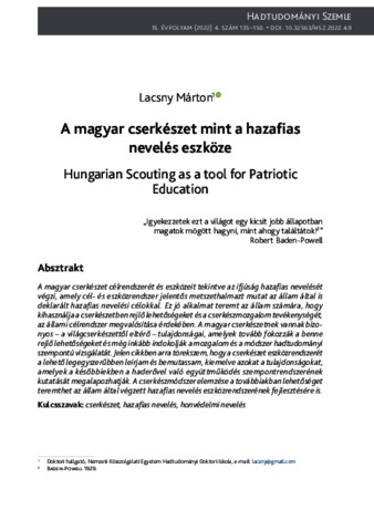 Lacsny, Márton Bálint (2022) A magyar cserkészet mint a hazafias nevelés eszköze = Hungarian Scouting as a tool for Patriotic Education. HADTUDOMÁNYI SZEMLE, 15 (4). pp. 135-150. ISSN 2676-9816 (nyomtatott); 2060-0437 (online)