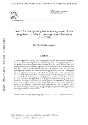Sirunyan, A.M. and Tumasyan, A. and Adam, W. and Ambrogi, F. and Asilar, E. and Csanád, Máté and Filipovic, Nicolas and Pásztor, Gabriella and Surányi, Olivér and Veres, Gábor and Bencze, György and Horváth, Dezső and Siklér, Ferenc and Veszprémi, Viktor and Béni, Noémi Tekla and Karancsi, János and Makovec, Alajos and Molnár, József and Szillási, Zoltán and Bartók, Márton and Ujvári, Balázs (2018) Search for disappearing tracks as a signature of new long-lived particles in proton-proton collisions at root s=13 TeV. JOURNAL OF HIGH ENERGY PHYSICS, 2018 (8). ISSN 1126-6708