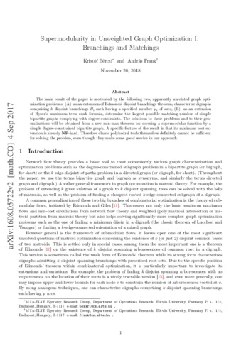 Bérczi, Kristóf and Frank, András (2018) Supermodularity in Unweighted Graph Optimization I: Branchings and Matchings. MATHEMATICS OF OPERATIONS RESEARCH, 43 (3). pp. 726-753. ISSN 0364-765X