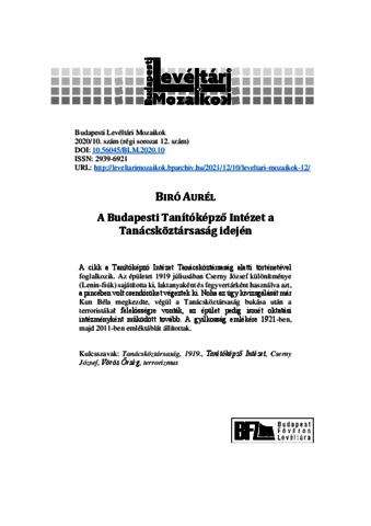 Biró, Aurél (2020) A Budapesti Tanítóképző Intézet a Tanácsköztársaság idején. BUDAPESTI LEVÉLTÁRI MOZAIKOK, 2020 (10). ISSN 2939-6921