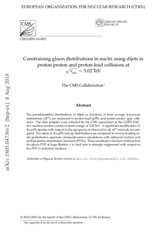 Sirunyan, A.M. and Tumasyan, A. and Adam, W. and Ambrogi, F. and Asilar, E. and Csanád, Máté and Pásztor, Gabriella and Veres, Gábor and Bencze, György and Horváth, Dezső and Siklér, Ferenc and Veszprémi, Viktor and Béni, Noémi Tekla and Karancsi, János and Makovec, Alajos and Molnár, József and Szillási, Zoltán and Ujvári, Balázs (2018) Constraining Gluon Distributions in Nuclei Using Dijets in Proton-Proton and Proton-Lead Collisions at root s(NN)=5.02 TeV. PHYSICAL REVIEW LETTERS, 121 (6). ISSN 0031-9007