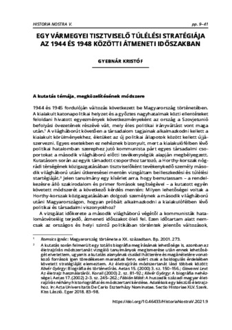 Gyebnár, Kristóf (2021) Egy vármegyei tisztviselő túlélési stratégiája az 1944 és 1948 közötti átmeneti időszakban. HISTORIA NOSTRA (5). pp. 9-41. ISSN 2064-325X