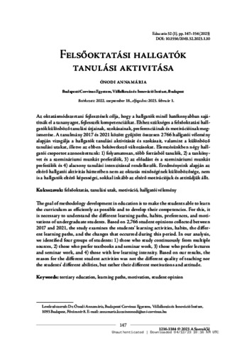 Kazainé Ónodi, Annamária (2023) Felsőoktatási hallgatók tanulási aktivitása. EDUCATIO, 32 (1). pp. 147-154. ISSN 1216-3384