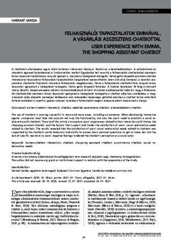 Harmat, Vanda (2021) Felhasználói tapasztalatok Emmával, a vásárlási asszisztens chatbottal. VEZETÉSTUDOMÁNY, 52 (3). pp. 29-39. ISSN 0133-0179