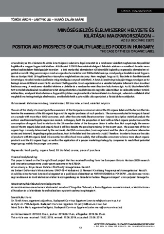 Török, Áron and Jantyik, Lili and Maró, Zalán Márk (2019) Minőségjelzős élelmiszerek helyzete és kilátásai Magyarországon – Az EU biocímke esete = Position and Prospects of Quality-Labelled Foods In Hungary: The Case of the EU Organic Label. VEZETÉSTUDOMÁNY : A BUDAPESTI CORVINUS EGYETEM HAVI SZAKFOLYÓIRATA, 50 (10). pp. 13-25. ISSN 0133-0179