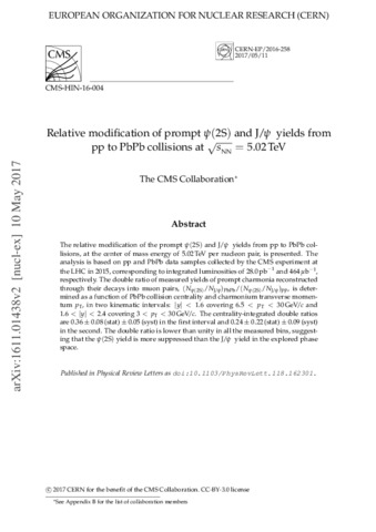 Sirunyan, A.M. and Tumasyan, A. and Adam, W. and Asilar, E. and Bergauer, T. and Filipovic, Nicolas and Bencze, György and Hajdú, Csaba and Horváth, Dezső and Siklér, Ferenc and Veszprémi, Viktor and Vesztergombi, György and Zsigmond, Anna Júlia and Karancsi, János and Makovec, Alajos and Molnár, József and Bartók, Márton and Trócsányi, Zoltán and Ujvári, Balázs and Veres, Gábor (2017) Relative Modification of Prompt ψ (2S) and J /ψ Yields from pp to PbPb Collisions at sNN =5.02 TeV. PHYSICAL REVIEW LETTERS, 118 (16). ISSN 0031-9007