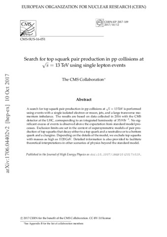 Sirunyan, A. M. and Tumasyan, A. and Adam, W. and Ambrogi, F. and Asilar, E. and Csanád, Máté and Filipovic, Nicolas and Pásztor, Gabriella and Bencze, György and Hajdú, Csaba and Horváth, Dezső and Siklér, Ferenc and Veszprémi, Viktor and Vesztergombi, György and Zsigmond, Anna Júlia and Makovec, Alajos and Molnár, József and Bartók, Márton and Ujvári, Balázs and Veres, Gábor (2017) Search for top squark pair production in pp collisions at root s=13 TeV using single lepton events. JOURNAL OF HIGH ENERGY PHYSICS (10). ISSN 1126-6708