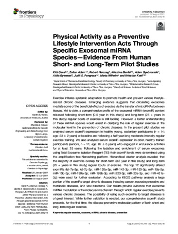 Garai, Kitti and Ádám, Zoltán and Herczeg, Róbert and Banfai, Krisztina and Gyebrovszki, A. and Gyenesei, Attila and Pongracz, Judit and Wilhelm, Márta and Kvell, Krisztian (2021) Physical Activity as a Preventive Lifestyle Intervention Acts Through Specific Exosomal miRNA Species-Evidence From Human Short- and Long-Term Pilot Studies. FRONTIERS IN PHYSIOLOGY, 12. e658218. ISSN 1664-042X