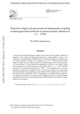 Sirunyan, A.M. and Tumasyan, A. and Adam, W. and Bergauer, T. and Dragicevic, M. and Bartók, Márton and Csanád, Máté and Lökös, Sándor and Major, Péter and Pásztor, Gabriella and Surányi, Olivér and Veres, Gábor and Bencze, György and Hajdú, Csaba and Horváth, Dezső and Siklér, Ferenc and Veszprémi, Viktor and Vesztergombi, György and Ujvári, Balázs and Csörgő, Tamás and Nemes, Frigyes and Novák, Tamás (2021) Search for singly and pair-produced leptoquarks coupling to third-generation fermions in proton-proton collisions at s=13 TeV. PHYSICS LETTERS B, 819. ISSN 0370-2693