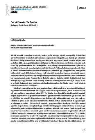 Ludmán, Katalin (2023) Deczki Sarolta: Tar Sándor (Budapest: Osiris Kiadó, 2022, 422 l.). IRODALOMTÖRTÉNETI KÖZLEMÉNYEK, 127 (1). pp. 123-126. ISSN 0021-1486