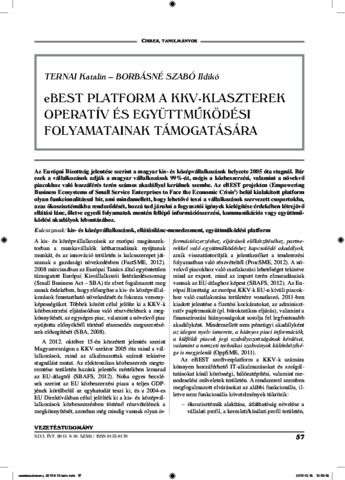 Ternai, Katalin and Borbásné Szabó, Ildikó (2015) eBEST platform a kkv-klaszterek operatív és együttműködési folyamatainak támogatására. VEZETÉSTUDOMÁNY, 46 (9-10). pp. 57-66. ISSN 0133-0179