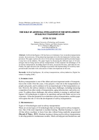 Ficzere, Péter (2023) The role of artificial intelligence in the development of railway transportation. DESIGN OF MACHINES AND STRUCTURES, 13 (1). pp. 67-73. ISSN 1785-6892