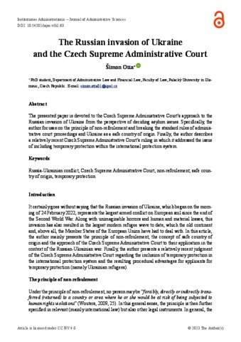 Otta, Šimon (2023) The Russian Invasion of Ukraine and the Czech Supreme Administrative Court. INSTITUTIONES ADMINISTRATIONIS - JOURNAL OF ADMINISTRATIVE SCIENCES, 3 (1). pp. 65-84. ISSN 2786-1929