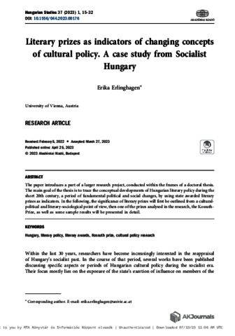 Erlinghagen, Erika (2023) Literary prizes as indicators of changing concepts of cultural policy. A case study from Socialist Hungary. HUNGARIAN STUDIES: A JOURNAL OF THE INTERNATIONAL ASSOCIATION FOR HUNGARIAN STUDIES AND BALASSI INSTITUTE, 37 (1). pp. 15-32. ISSN 0236-6568
