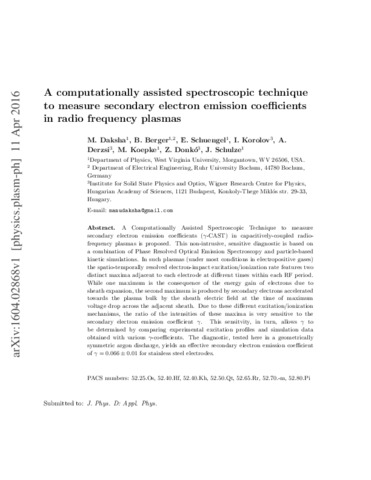 Daksha, M. and Berger, B. and Schuengel, E. and Korolov, Ihor and Derzsi, Aranka and Donkó, Zoltán (2016) A computationally assisted spectroscopic technique to measure secondary electron emission coefficients in radio frequency plasmas. JOURNAL OF PHYSICS D-APPLIED PHYSICS, 49 (23). ISSN 0022-3727