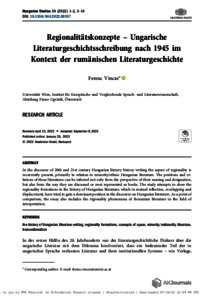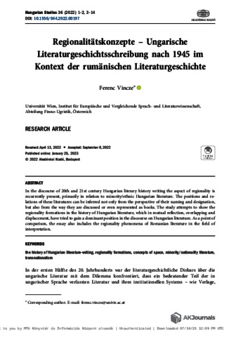 Vincze, Ferenc (2022) Regionalitätskonzepte – Ungarische Literaturgeschichtsschreibung nach 1945 im Kontext der rumänischen Literaturgeschichte. HUNGARIAN STUDIES: A JOURNAL OF THE INTERNATIONAL ASSOCIATION FOR HUNGARIAN STUDIES AND BALASSI INSTITUTE, 36 (1-2). pp. 3-14. ISSN 0236-6568