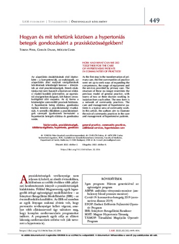 Torzsa, Péter and Csatlós, Dalma Dorottya and Móczár, Csaba (2022) Hogyan és mit tehetünk közösen a hypertoniás betegek gondozásáért a praxisközösségekben? = How and what can we do together for the care of hypertensive patients in communities of practice? LEGE ARTIS MEDICINAE, 32 (10). pp. 449-454. ISSN 0866-4811