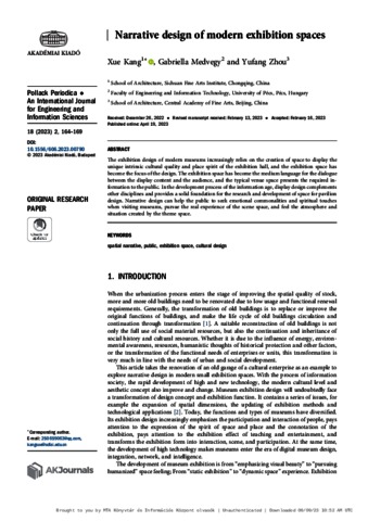 Kang, Xue and Medvegy, Gabriella and Zhou, Yufang (2023) Narrative Design of Modern Exhibition Spaces. POLLACK PERIODICA : AN INTERNATIONAL JOURNAL FOR ENGINEERING AND INFORMATION SCIENCES, 18 (2). pp. 164-169. ISSN 1788-1994 (print); 1788-3911 (online)
